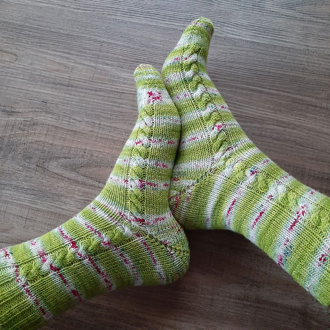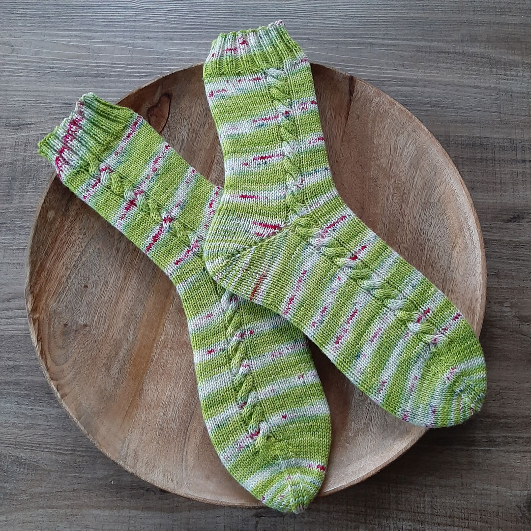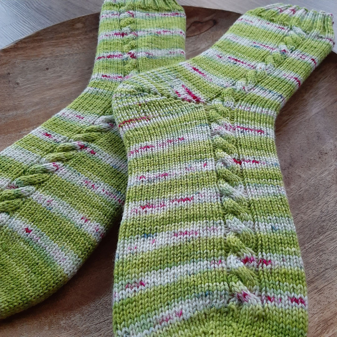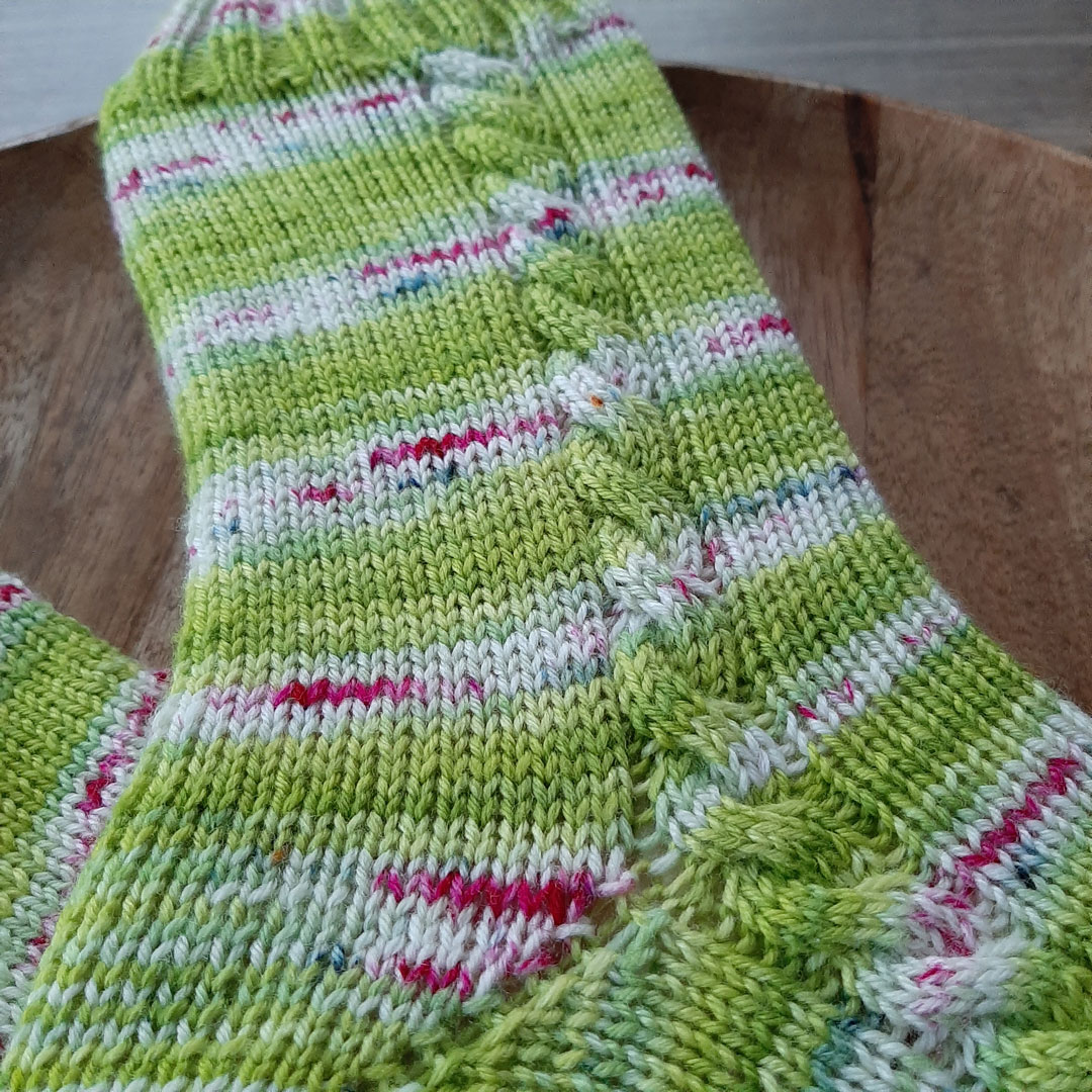 Die Anleitung „Doppelzopf“ ist eine Sockenanleitung mit einem Zopfmuster. Dieses zieht sich auf beiden Seiten des Fußes bis ganz nach unten. Das engmaschige Zopfmuster neigt sich dabei jeweils zur Mitte hin.