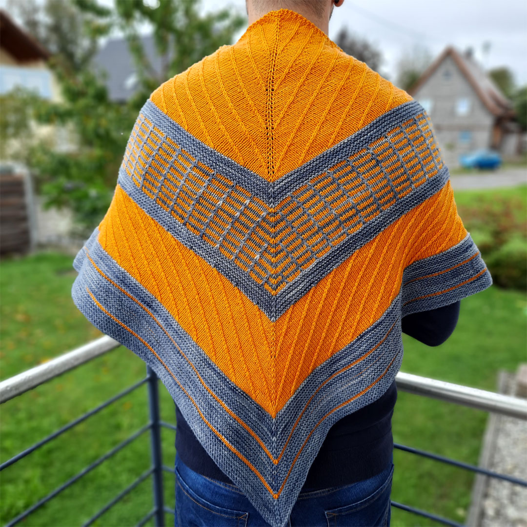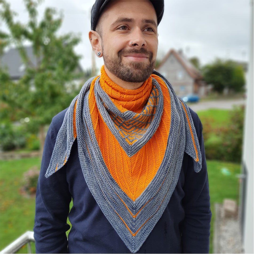 Das Dreieckstuch „Lines and Tiles“, zu Deutsch Linien und Kacheln, verbreitert sich aus der Mitte heraus mit einer Mittelmasche und einer kraus rechten Bordüre an den Außenkanten.