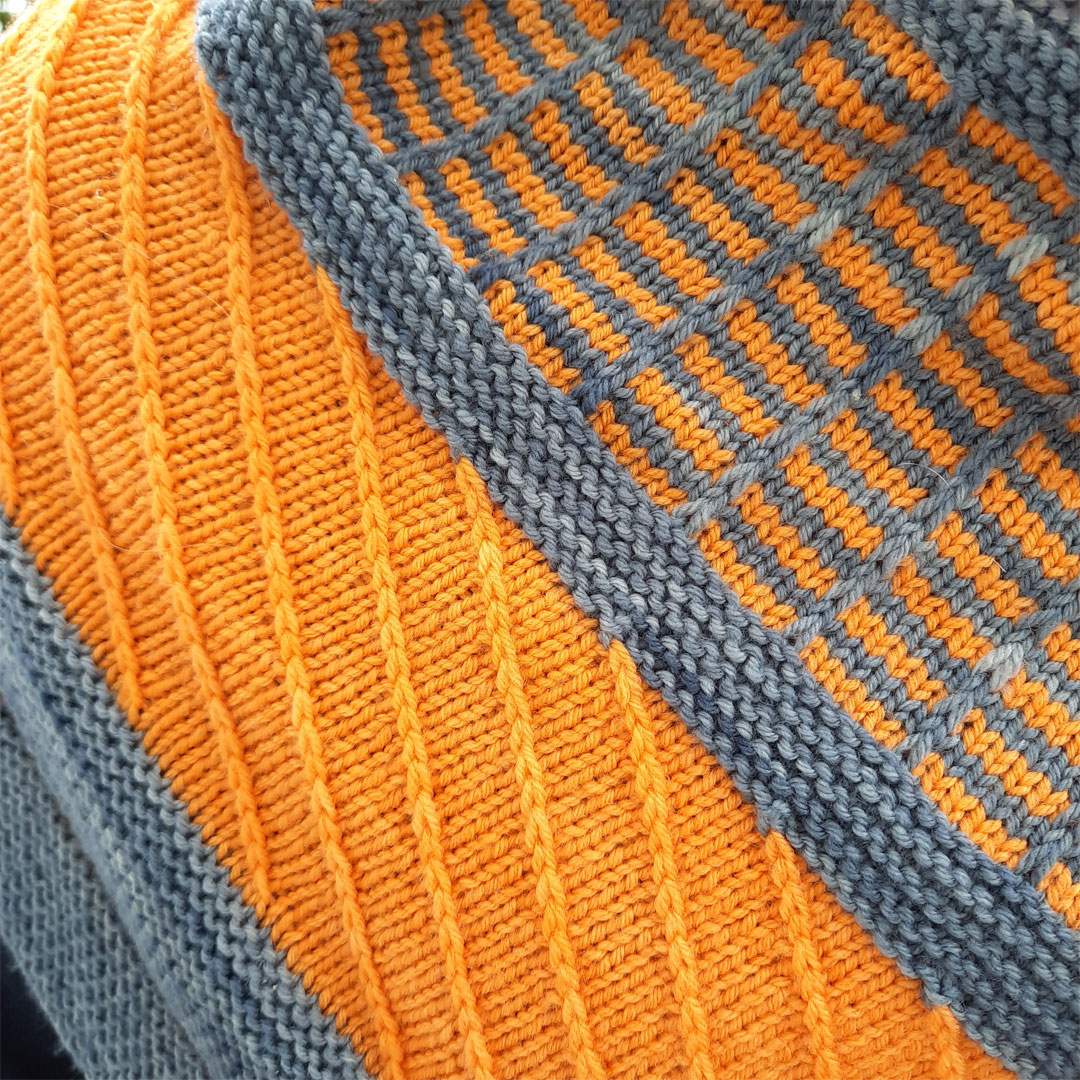 In der Anleitung werden 2 kontrastreiche Farben in 3 unterschiedlichen Mustern verwendet. In der Anleitung werden rechte und linke Maschen, Hebemaschen und verkreuzte Maschen verwendet.