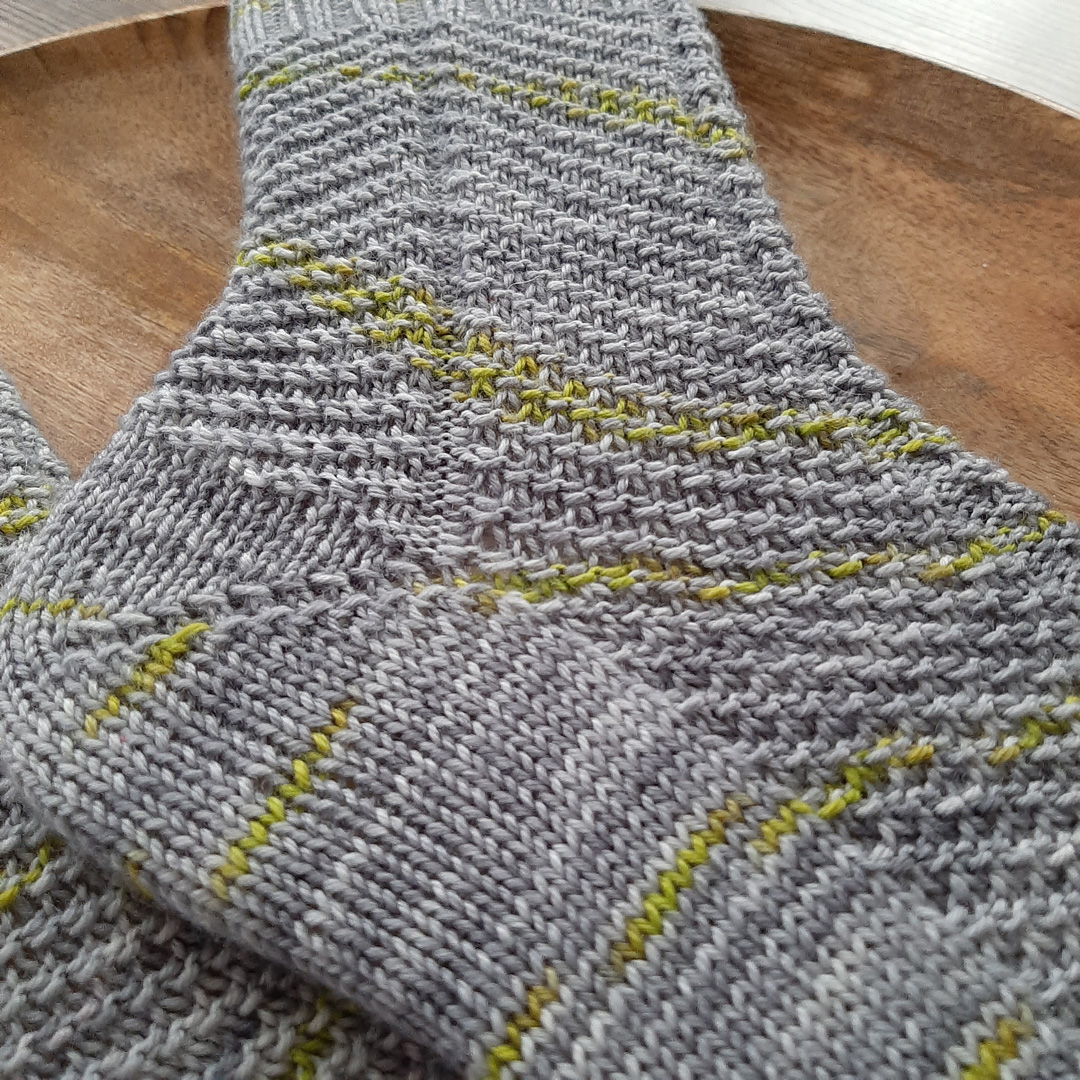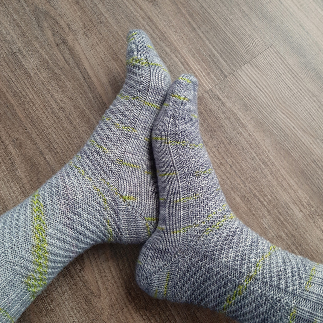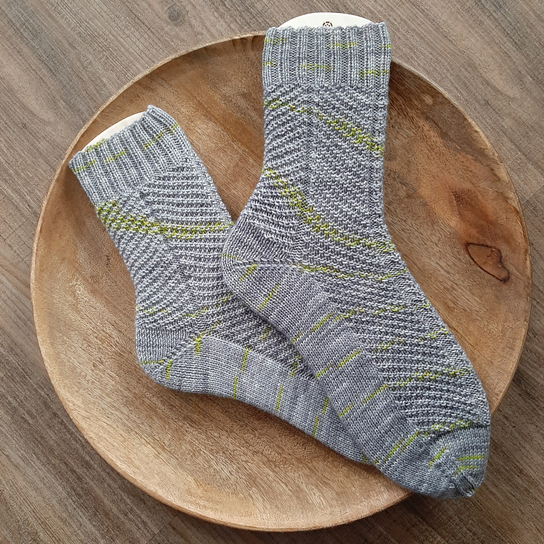 Die Anleitung „Schrägling 4-fach“ ist eine Sockenanleitung mit schrägverlaufendem Muster aus linken und rechten Maschen. Das „4-fach“ bezieht sich auf die verwendete 4-fädige Sockenwolle. Die Anleitung ist entsprechend auch für eine 4-fädige Wolle erhältlich